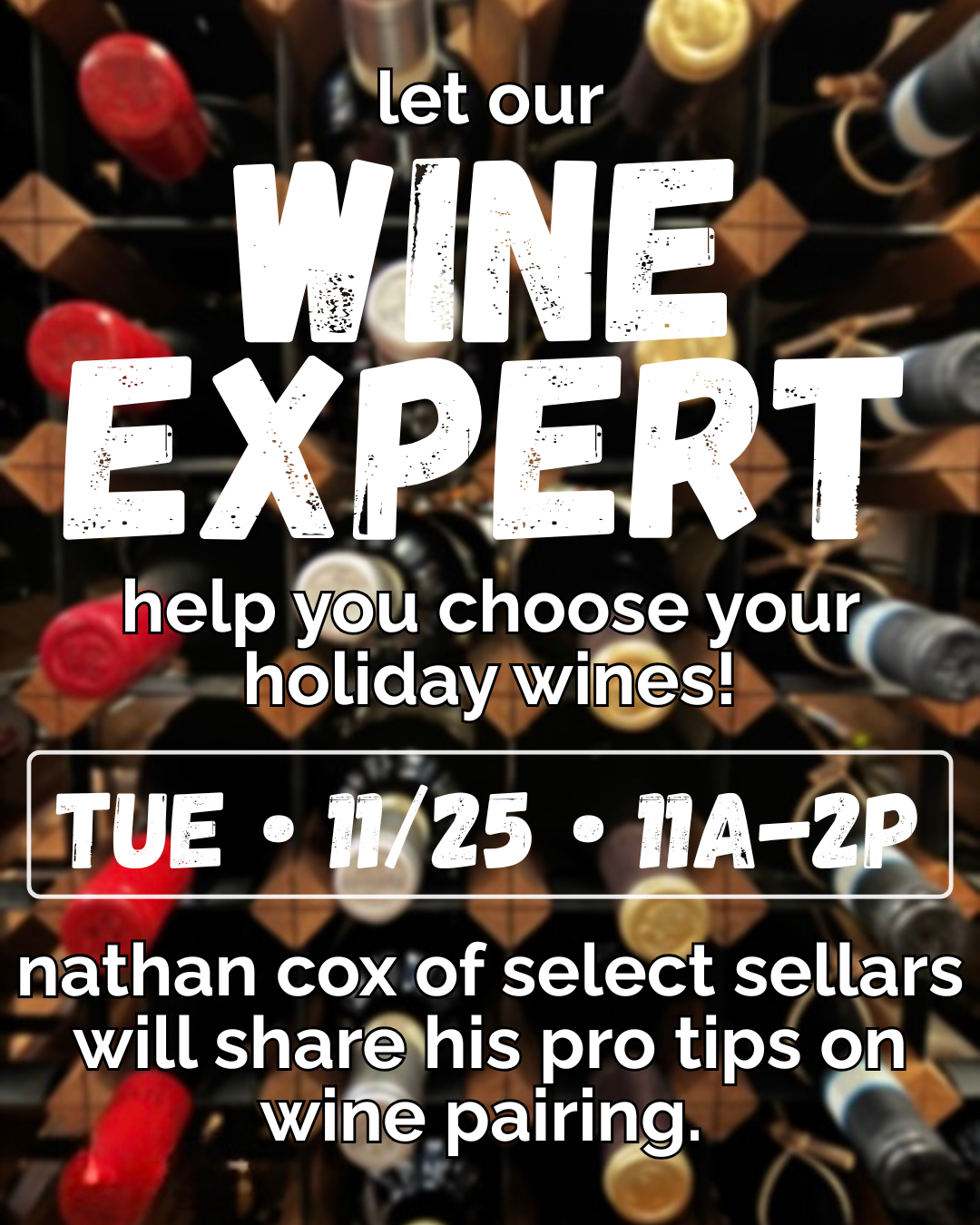 BACK TO WEBSITE Date: 11/25/25 Time: 11:25 pm – 02:03 pm Details: Nathan Cox will help you chose your Holiday Wines